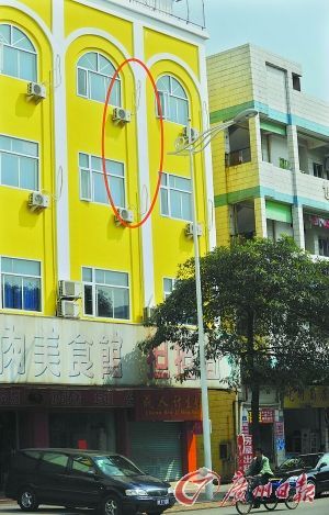 刘某就是从四楼的窗口翻逃坠亡的,红圈中所示的空调排水管已被他抓断一截。记者卢政摄
