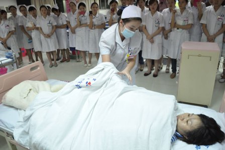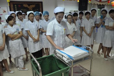 为使病人的病床清洁、平整、舒适,保持病室整洁、美观,同时预防病人发生褥疮。10月7日晚,我院护理部在四楼多功能会议室举办卧床病人更换床单法培训。由产科护士朱丽演示,全院护理部近100人观摩了整个床单更换过程。