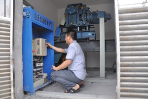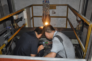 电梯公司工作人员在电梯机房检查