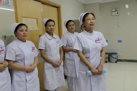 鲁姣霞护士长(左)向大家介绍护理教学查房