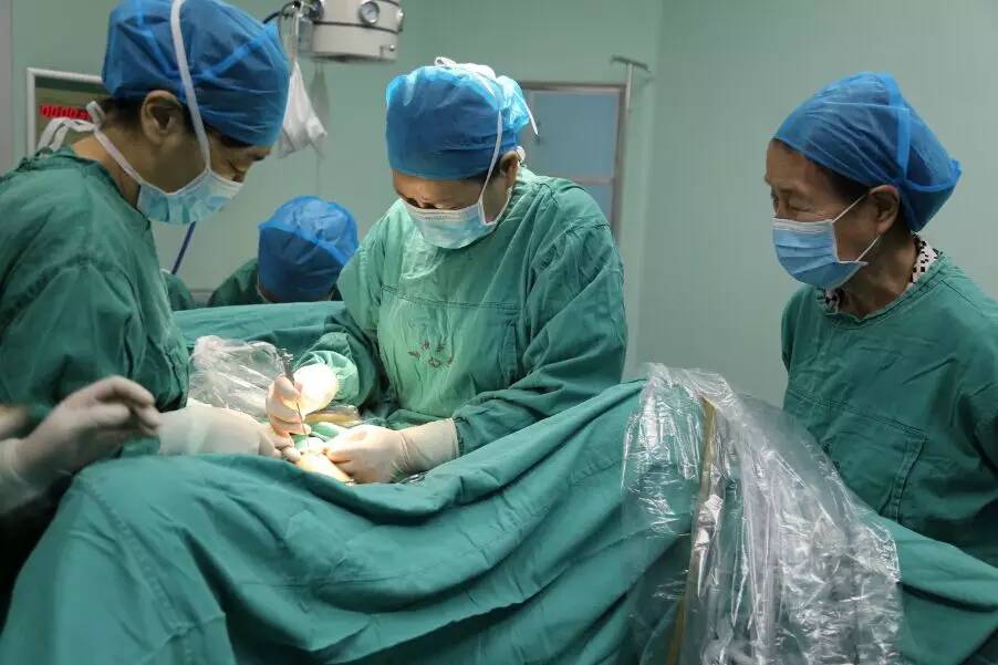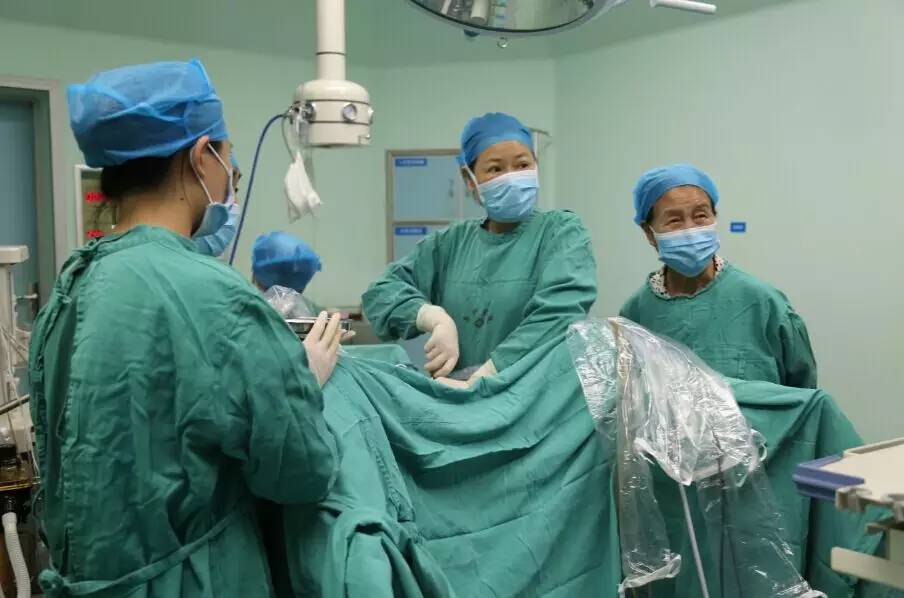 夏恩兰教授在观摩指导郑奎主任等为患者施行宫腹腔镜手术