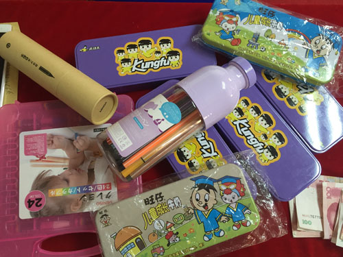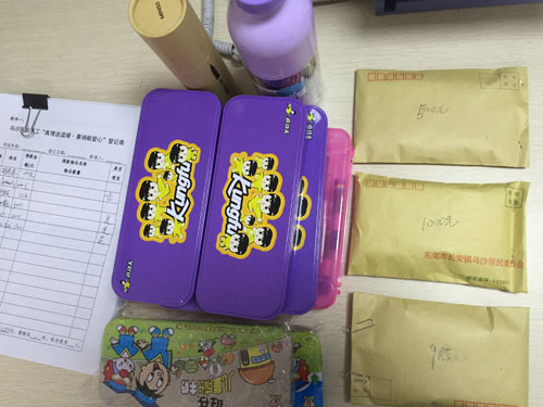 募捐爱心物品6个文具盒,14套衣服,1个书包、2盒彩色铅笔