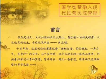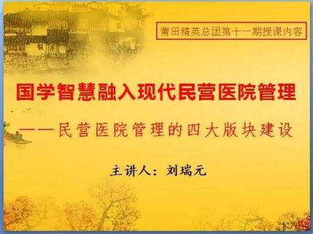 刘总结合自己多年来,在医疗行业拼搏奋斗的实践经验,以及自己对国学智慧的研究,将国学智慧融会到医院管理之中,并上升到理论高度,形成了自己独特的"刘氏"医院管理文化,而倍受莆田精英阶层推崇。刘总曾说,中华文明渊源流长,中华文化博大精深。从古代的"晋商",到今天的"儒商",再到波及全球的"国学商道"之风,中国传统文化在现代企业管理中成为不可或缺的因素。