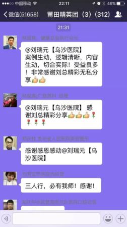 刘总的讲课,深入浅出,生动形象,幽默风趣,寓教于乐,让人茅塞顿开受益匪浅。在聆听了刘总的讲课后,大家纷纷点赞。健康总会执行会长林国良说:"案例生动,逻辑清晰,内容生动,切合实际!受益良多!非常感谢刘总精彩无私分享。"五和集团陈丽聪说:"从头到尾聆听您的高大上的讲座,将国学文化融入民营医院的管理,娓娓道来,用经典故事为佐证,阐述无为而治,人尽其才的管理理念,受益匪浅!";郑州天伦医院院长金环说:"您好,刘总!从头到尾聆听您的高大上的讲座,耳目一新,您将国学文化融入民营医院的管理,用经典故事为佐证,阐述"无为而治,人尽其才"的管理理念,也总结了莆系管理的成功经验和博大胸怀,受益匪浅!我本人也是有这种理念下的受益者,感同身受!";陈青霞总经理说:"当今能说还能做的能者着实不多,刘乃其中之一。"