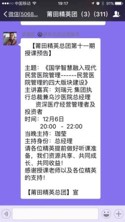"莆田精英团"微信群,由"健康产业总会执行会长林国良"创建。旨在帮助医界精英们切磋交流、相互学习、共同提高、传递正能量。"莆田精英团"之前已授课10期,此次为11期,特邀请创新高集团执行总裁兼乌沙医院总经理刘瑞元任主讲嘉宾,珈莹担任主持。