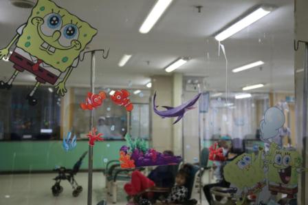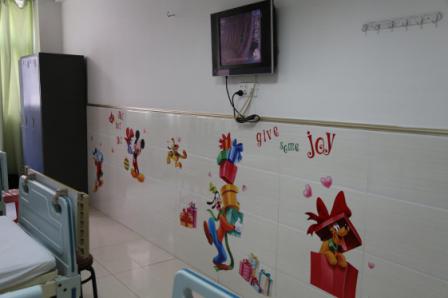 为了让小患者们更好地适应就医环境,忘却病痛和治疗的恐惧,近日,乌沙医院对儿科病区进行了新的装饰。在乌沙医院儿童输液室、儿科病房的墙壁和玻璃上,张贴了各种卡通人物、动物、花草等装饰图案:萌哒哒的海绵宝宝、活泼可爱的米老鼠和唐老鸭、五彩斑斓的蝴蝶、奇幻妙趣的海洋动物……别具一格的装饰充满了赏心悦目的色彩,为儿科病区营造了温馨舒适的环境。
