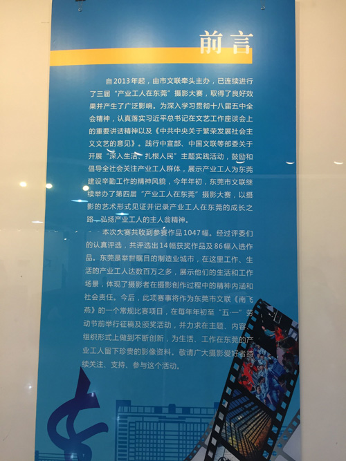 据悉,本次大赛共征集到了参赛稿件1047幅,为了保证大赛的公平公正,所有参赛作品在初选时便隐去了姓名进行编号,再经过评委们三轮认真的评选,共评选出14幅获奖作品及86幅入选作品。本次摄影大赛不仅提供了许多珍贵的照片和感动的瞬间,同时也是一个群体和一个时代的缩影,为东莞的发展保留了珍贵的影像记忆。颁奖的同时,所有获奖及入选作品均进行展出,展览时间为4月24日至5月8日。旨在通过影像全面地展示产业工人在东莞的生活、工作情况,为东莞的产业工人留下珍贵的影像资料。