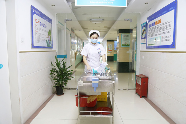 配好药后,王鹏程推着放满药品的推车,前往病房挂针。