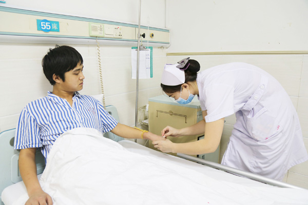 上午11:00左右,王鹏程仔细地为病人寻找血管,经过消毒后,帮病人进行输液。