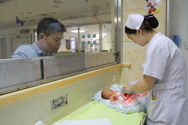 王鹏程在细心地为新生儿洗澡,由于新生儿的皮肤又薄又娇嫩,每一个动作都要万分小心。