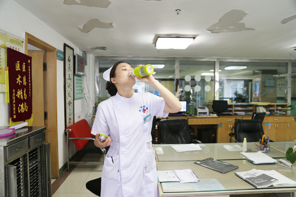 完成一系列工作后,王鹏程才顾得上喝口水,她额头上已渗出了细细的汗珠。