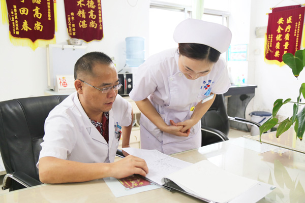 病人输药期间,王鹏程就了解到的病人情况及时跟内科胡宏主任进行沟通。
