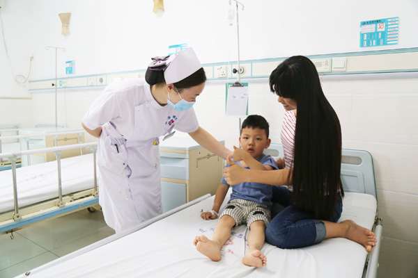 内儿科护士长朱艳妹对王鹏程进行督促指导。