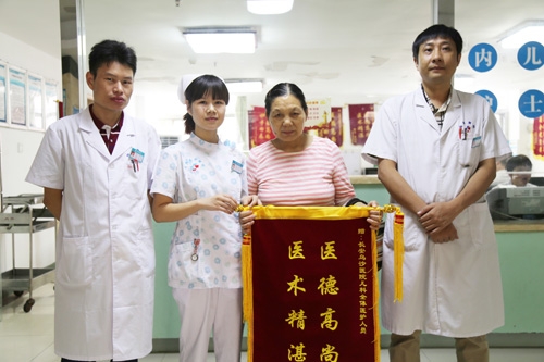 10月15日上午,长安镇乌沙医院儿科迎来了一位特殊的客人,她将一面印有“医德高尚医术精湛”字样的锦旗送到医护人员手上,以此感谢儿科邓林龙主任、李正武医师及全体医护人员对她孙子的精心治疗和热心照顾。