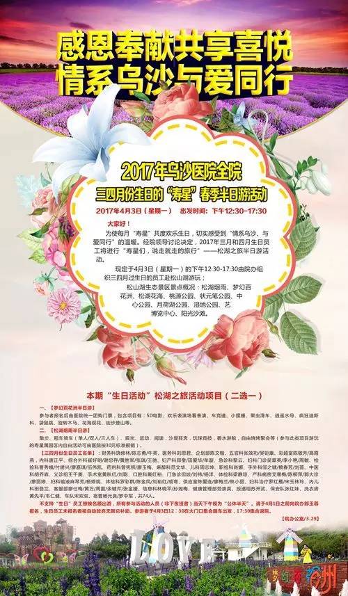 为使每月“寿星”共度欢乐生日,切实感受到“情系乌沙、与爱同行”的温暖。4月3日下午,乌沙医院3、4月份“寿星”70多人赶着暮春,分乘两辆医院大巴赴松山湖展开醉美烂漫之旅。大家观看了表演、车竞速、小摆锤、果虫滑车、逍遥水母、疯狂迪斯科、袋鼠跳、旋转木马、花海观花、徒步登山等。