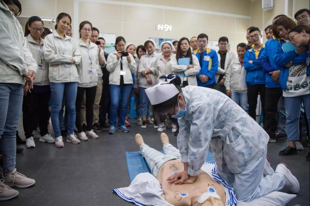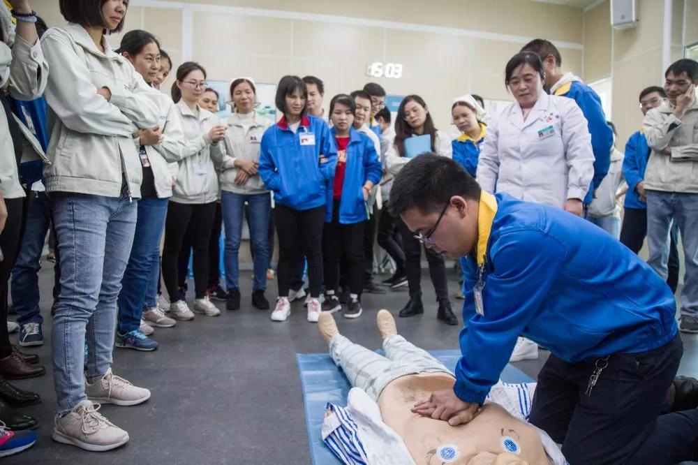 急诊科护士黄志芳现场模拟演示和指导心肺复苏操作的全过程,培训人员学习积极主动、兴趣浓厚,纷纷主动上场练习。